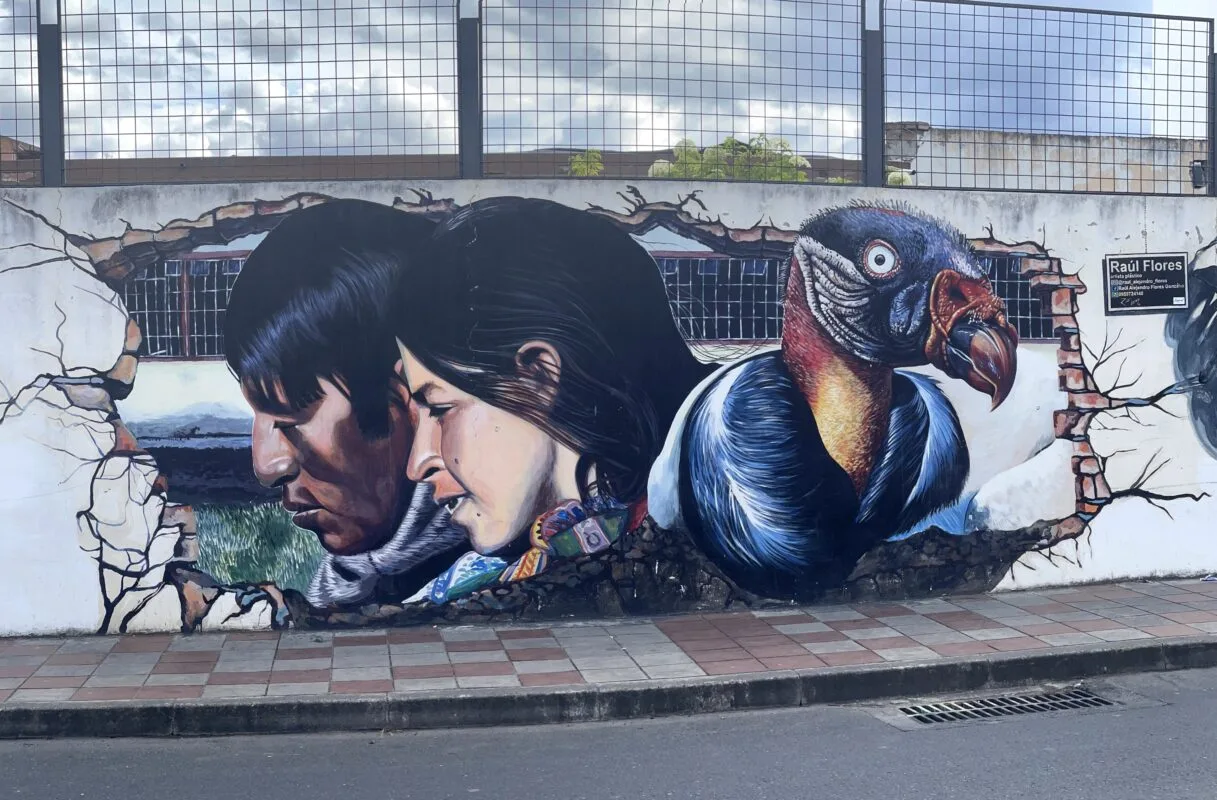 Este mural representa la identidad ecuatoriana a través de la conexión entre sus raíces indígenas, simbolizadas por el hombre y la mujer, y el cóndor andino, emblema de libertad y fuerza. La ruptura del muro refleja la lucha por preservar y afirmar esta identidad frente a los desafíos del tiempo.
