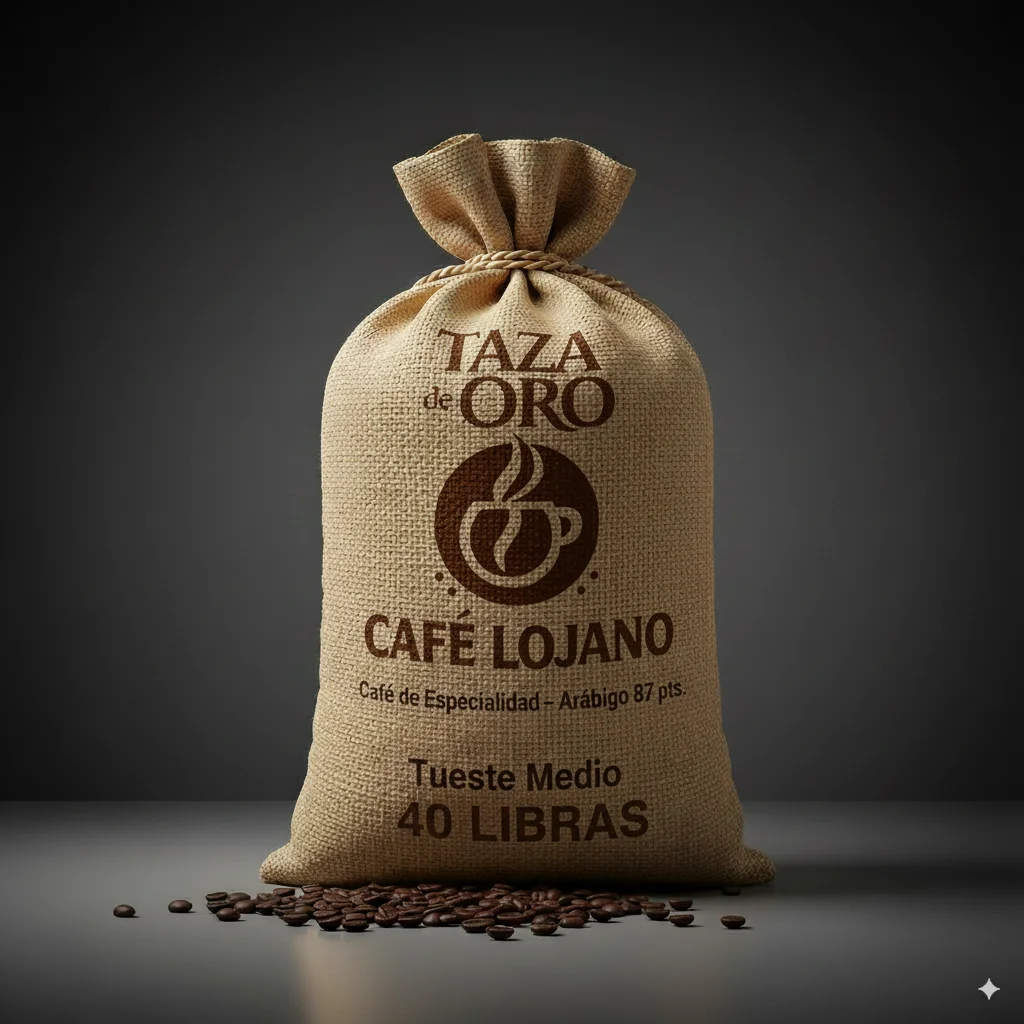 Saco de 40 libras de Café Lojano de Especialidad – Arábigo 87 pts, tueste medio. Cultivado en Loja, Ecuador, con calidad premium reconocida por su puntaje internacional.